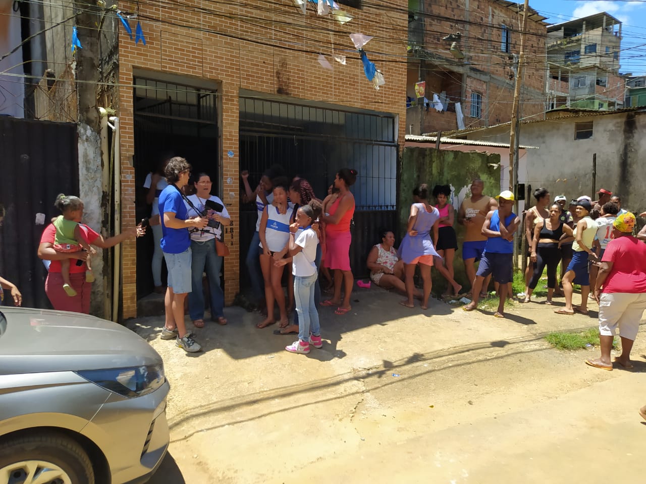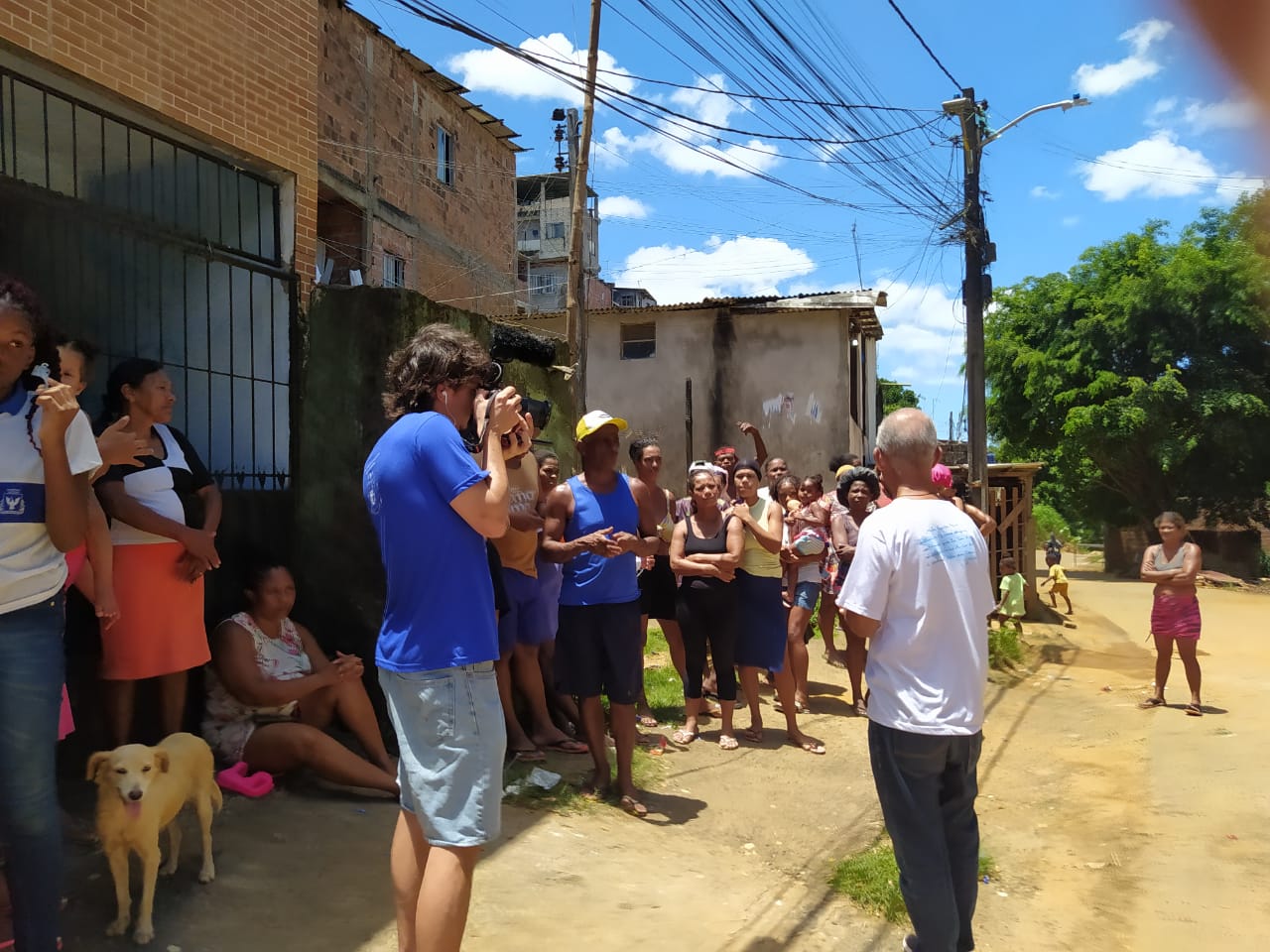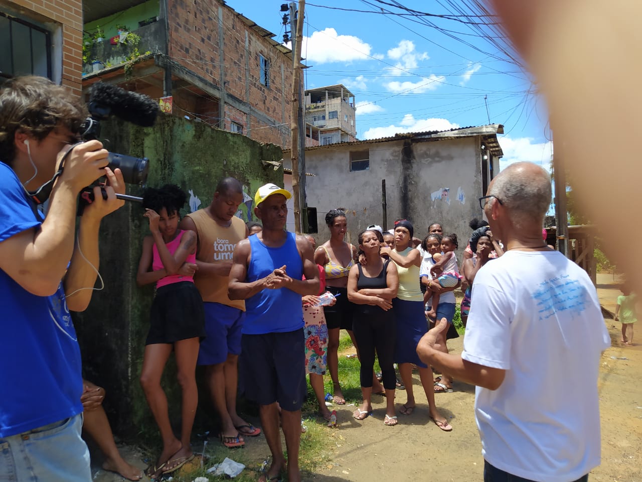 Matteo fez entrevista com alunos e pessoas da comunidade. Acompanhou a compra, transporte e distribuição das cestas básicas. Foi preciso 3 carros para levar as 60 grandes cestas para a BM. Levamos chocolates para as crianças e panetone para os alunos.