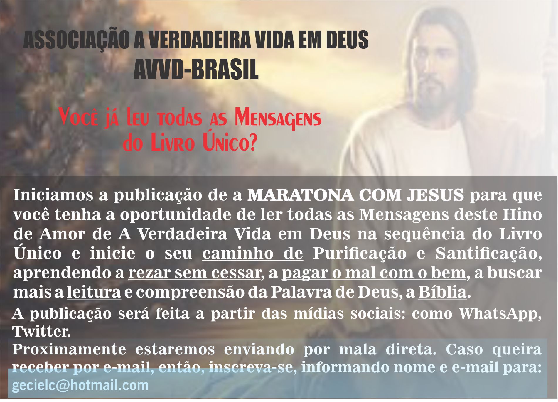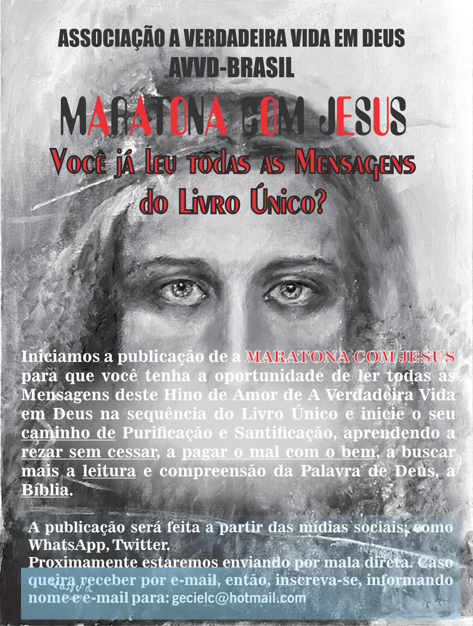Então, será uma verdadeira MARATONA COM JESUS, na persistência da leitura e reflexão diária de cada Mensagem. É uma oportunidade ímpar para que todos iniciemos no caminho de purificação e santificação, aprendendo a rezar sem cessar, a pagar o mal com o amor, a buscar a leitura e compreensão da Palavra de Deus, a Bíblia Sagrada.