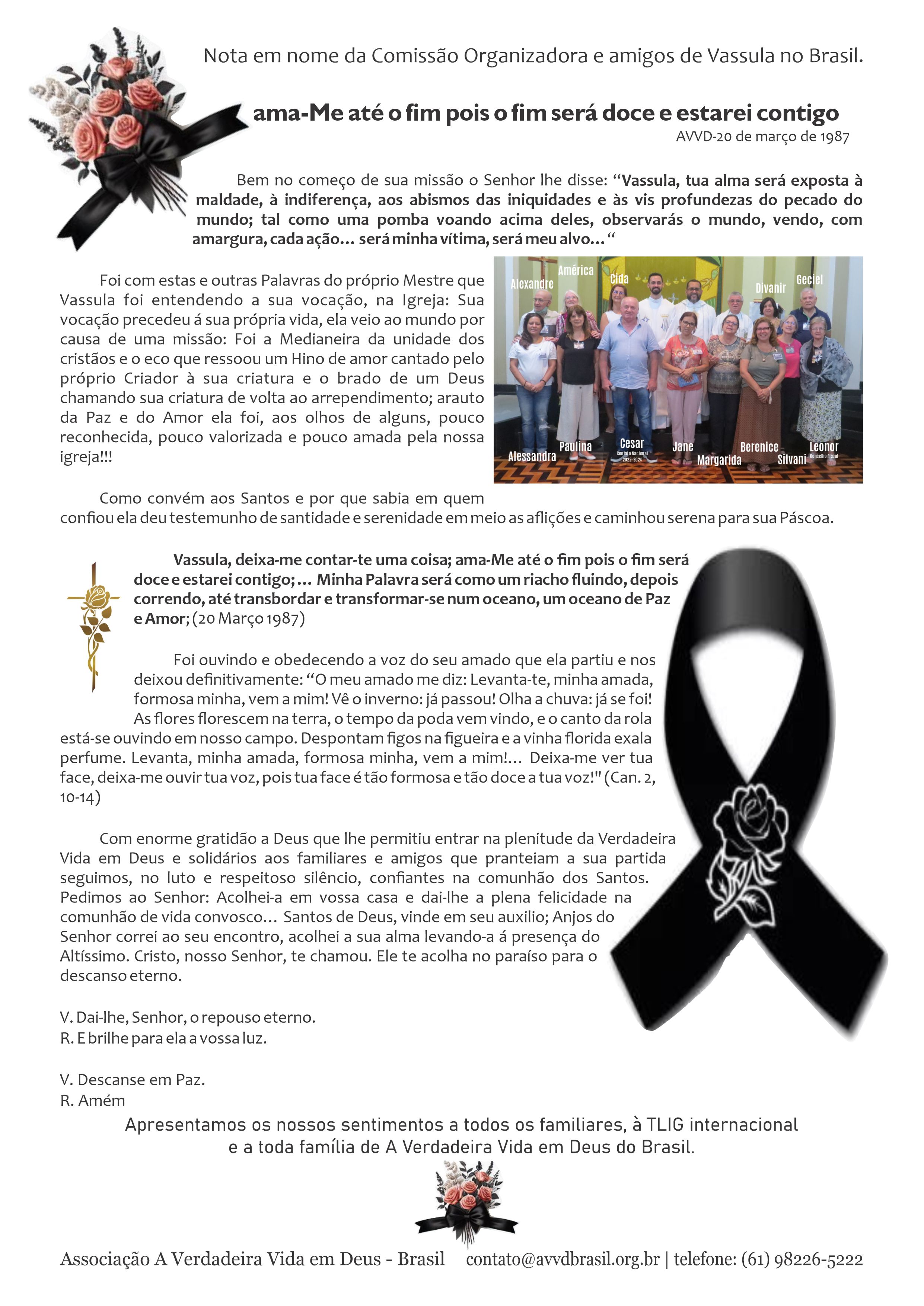 Não poderíamos deixar de fazermos uma homenagem a Vassula Rydén por conta de sua partida, no dia 25/09/2024, para sua morada eterna nos braços do Pai e, em plena felicidade, onde os Dois Sagrados Corações a esperavam com os Anjos e os Santos em grande festa nos Céus.