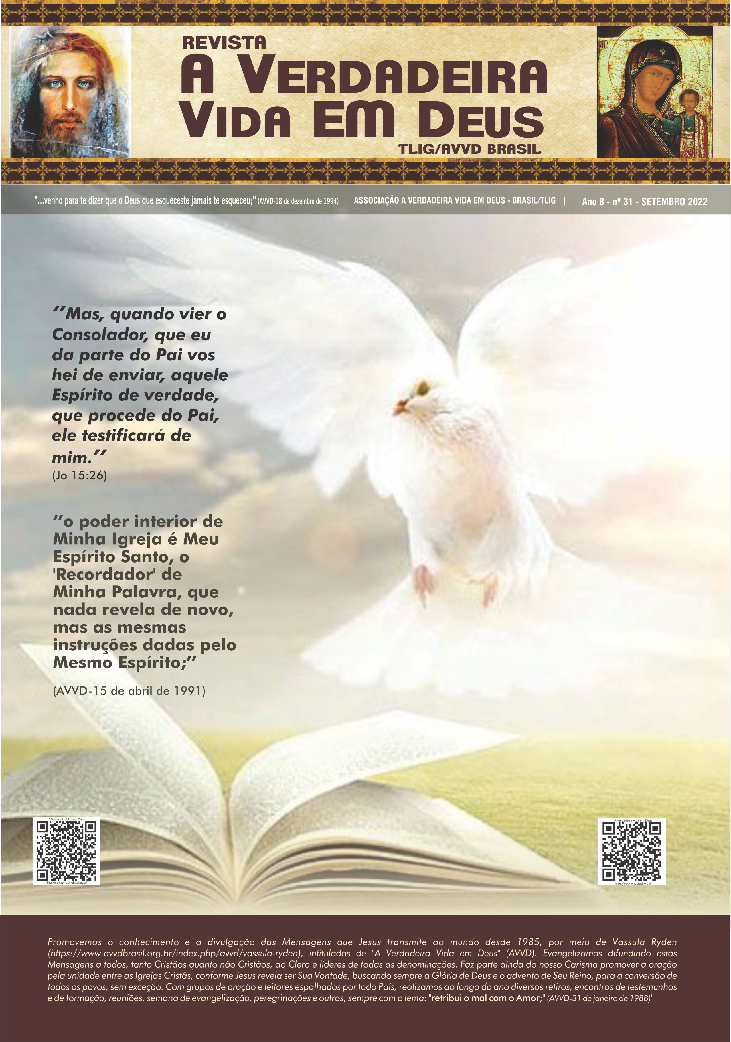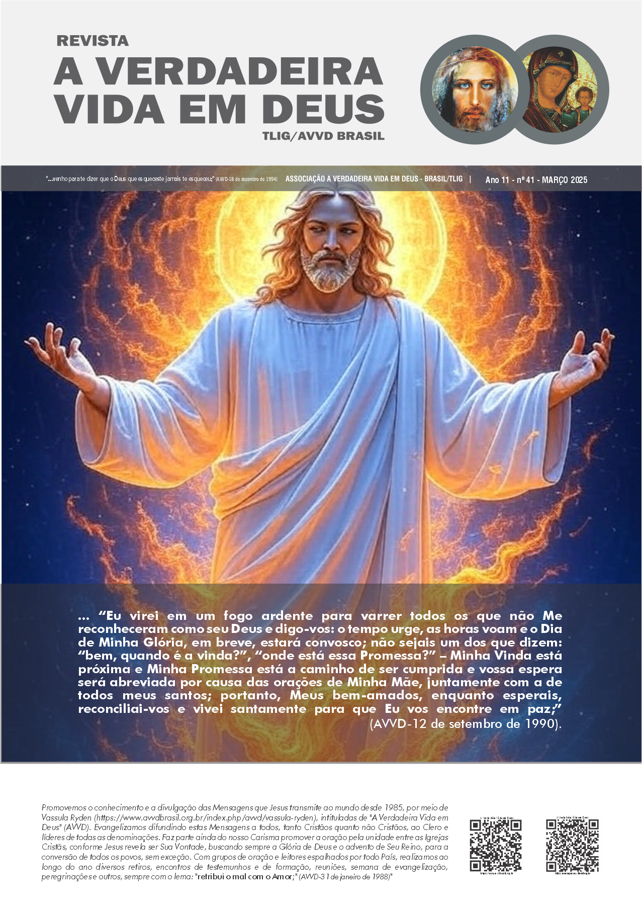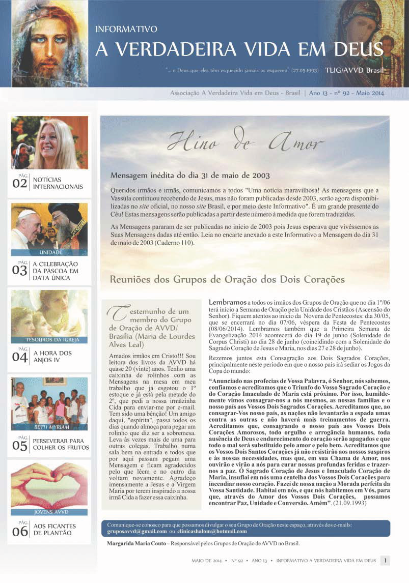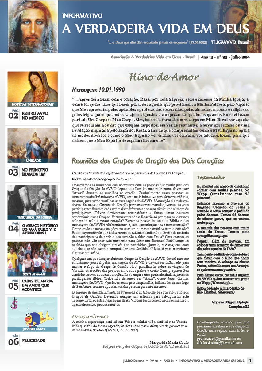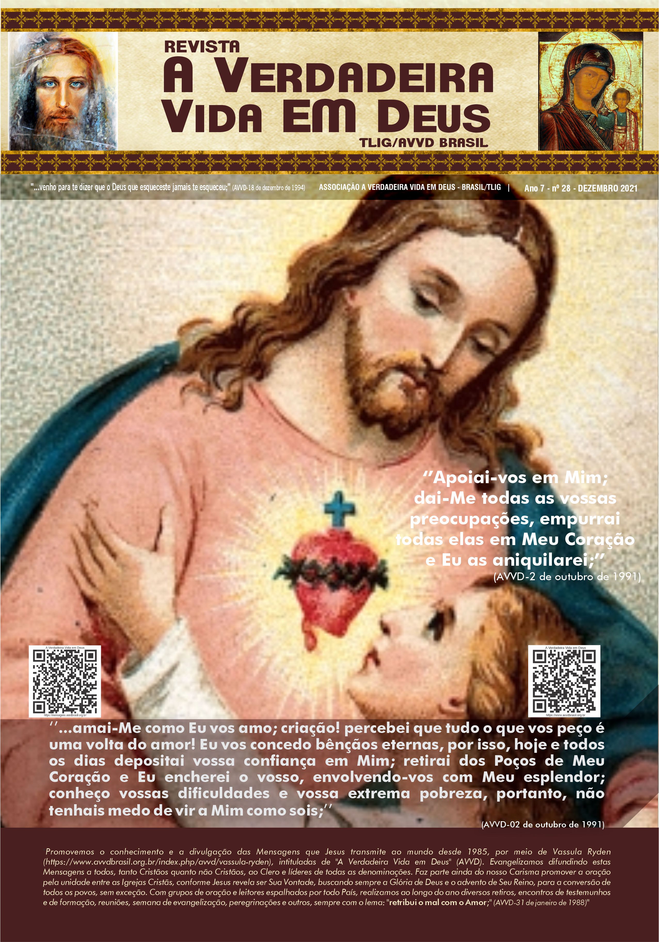 A Revista A Verdadeira Vida em Deus é repleta com informações das missões de Vassula, outras atividades da TLIG ao redor do mundo, atividades da AVVD-Brasil e vários outros ensinamentos espirituais das Mensagens. Faz sua assinatura.