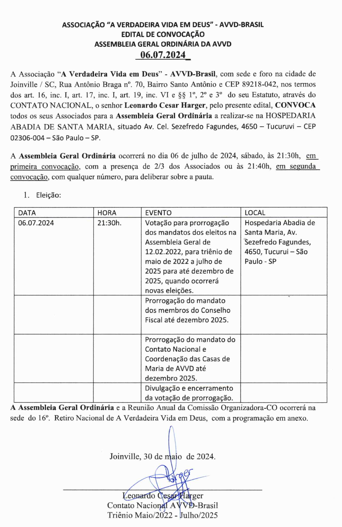 A ASSOCIAÇÃO A VERDADEIRA VIDA EM DEUS - BRASIL, AVVD - BRASIL, CNPJ: 20.087.868/0001-88, é uma associação civil sem fins lucrativos, com duração indeterminada, tem por fim a evangelização, através da difusão das mensagens de A Verdadeira Vida em Deus a todas as pessoas, tanto cristãos quanto não cristãos, e de todas as denominações religiosas, em todo o território brasileiro - objetivando a UNIDADE DOS CRISTÃOS.