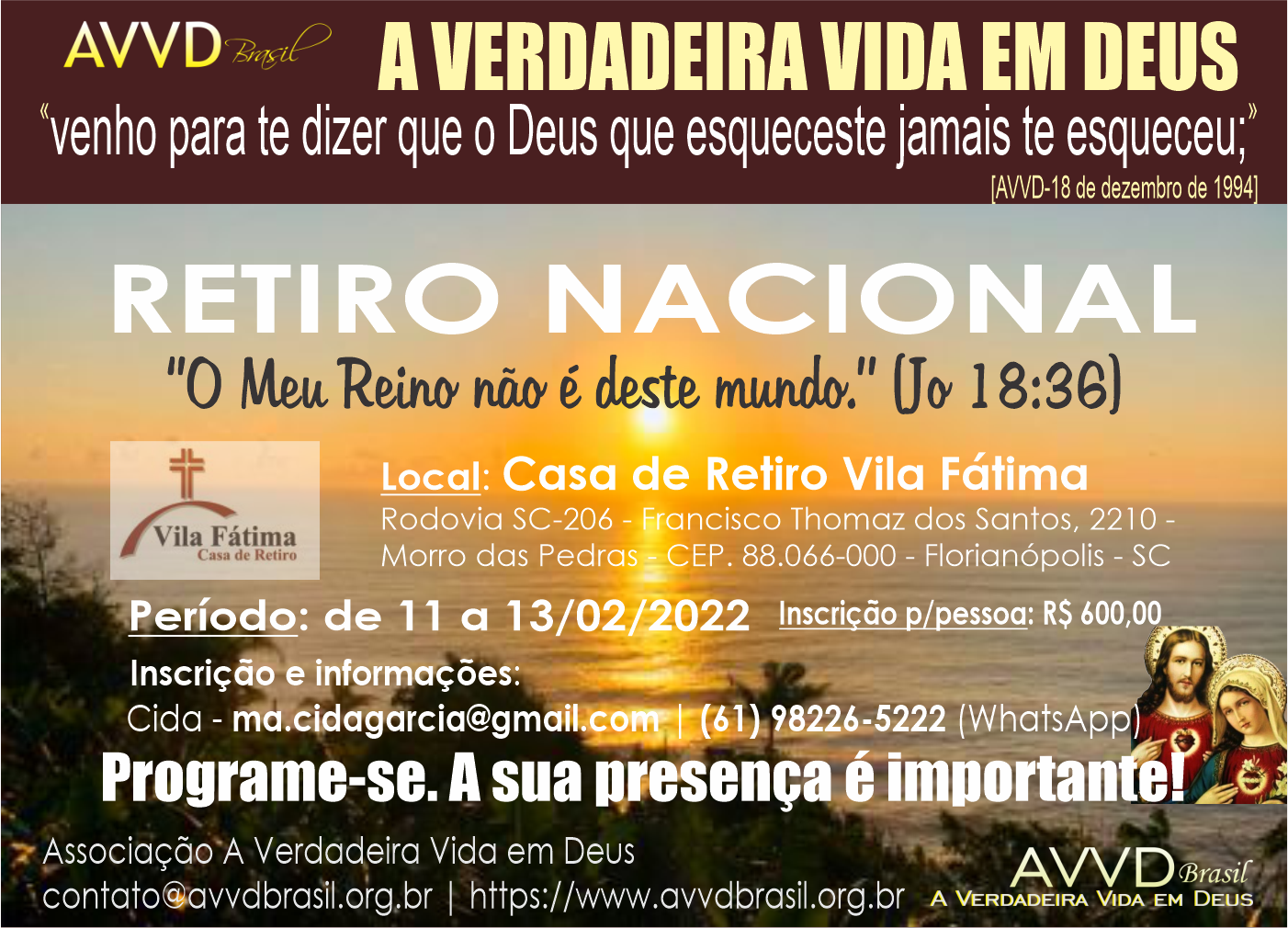 Com imenso prazer comunicamos a realização próxima de nosso Retiro Nacional. Estivemos afastados por muito tempo, em função da pandemia, e agora será possível nos encontrarmos novamente e rezarmos juntos. Nesse próximo retiro teremos a oportunidade de elegermos a nova equipe de Coordenação das atividades desenvolvidas pela Associação, na divulgação do Amor de Deus por todos nós neste maravilhoso Hino de Amor, que são as Mensagens de A Verdadeira Vida em Deus. Venha participar conosco de momentos de oração intensos; e desde já, favor colocar a realização do Retiro Nacional em suas orações, para que a vontade da Trindade Santa, por intercessão de nossa Mãe Maria Santíssima, sempre prevaleça. Obrigado!